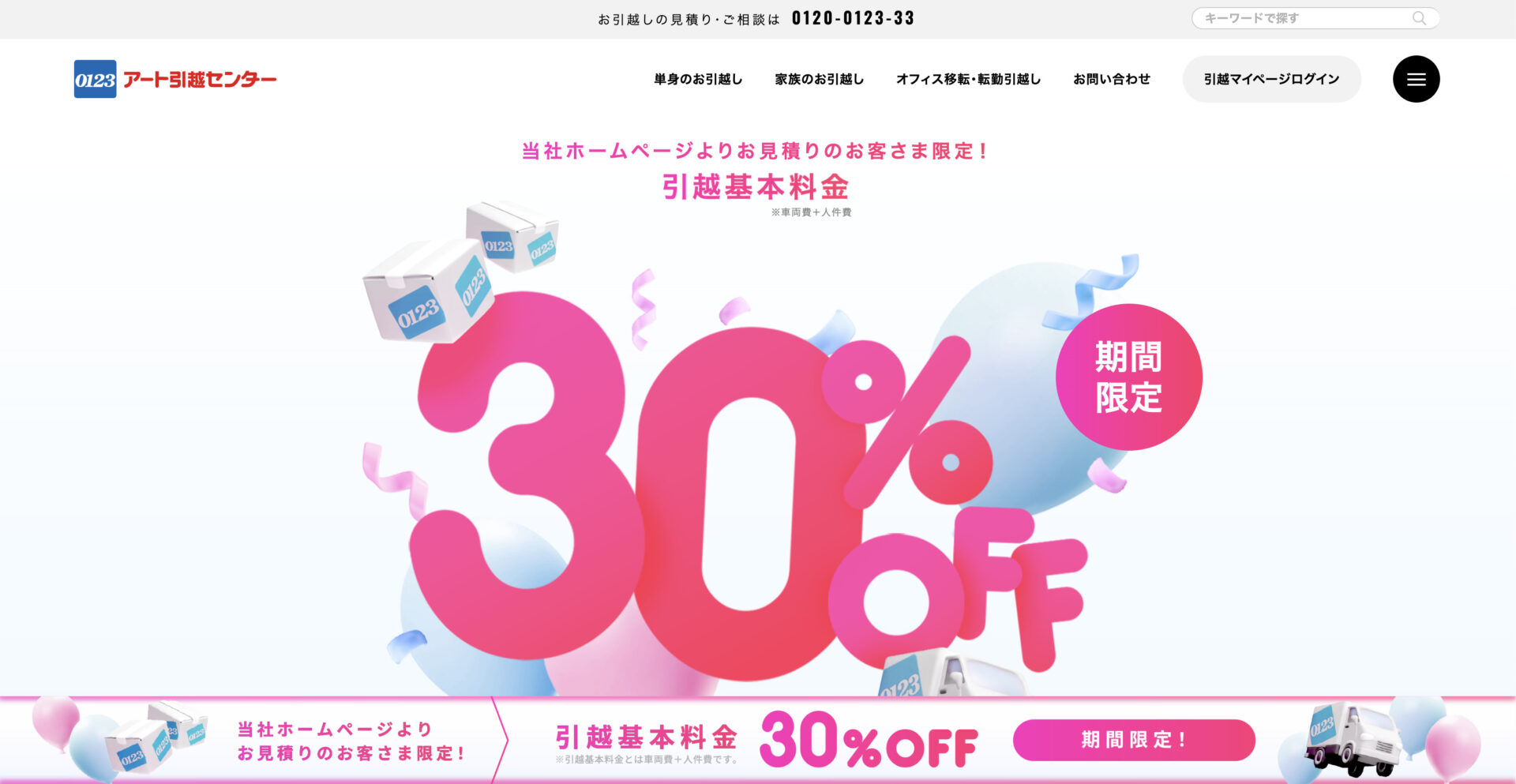 アート引越センターでは、公式サイトから見積もりを申し込むことで、引越基本料金が30%オフになるキャンペーンを実施しています。申込期間は2025年11月1日〜2026年2月28日までで、車両費+人件費が割引対象です。